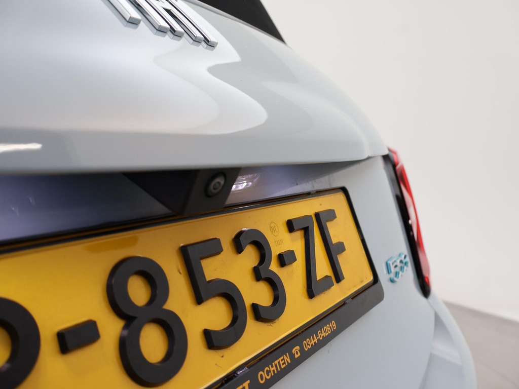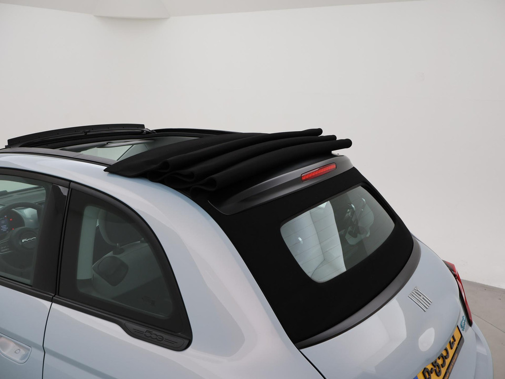 Fiat 500e cabrio / 500C 534 kWh in de super gave kleur Celestial Blue, Zeer compleet met breedbeeld navigatie + digitale cockpit met navigatie kaartweergave, Stoelverwarming, Draadloze Apple Carplay appstreaming, 17 inch lichtmetalen velgen, Achteruitrijcamera, Climate control, Leder stuurwiel, LED dagrijverlichting, LED achterlichten, Bluetooth, DAB+ digitale radio, Cruise control.