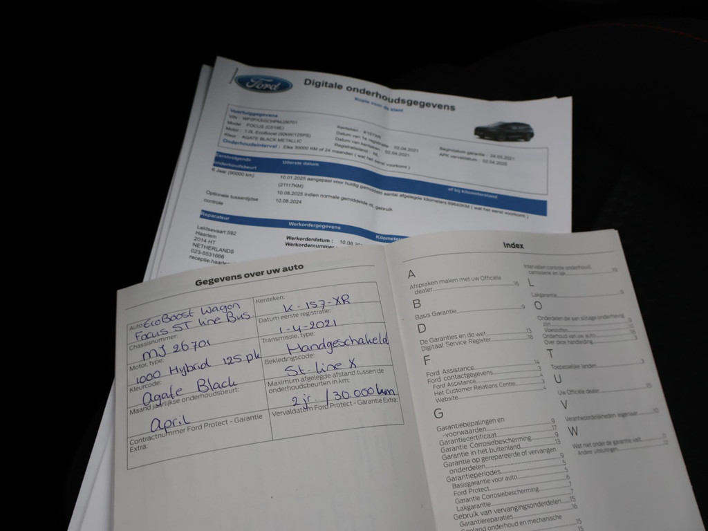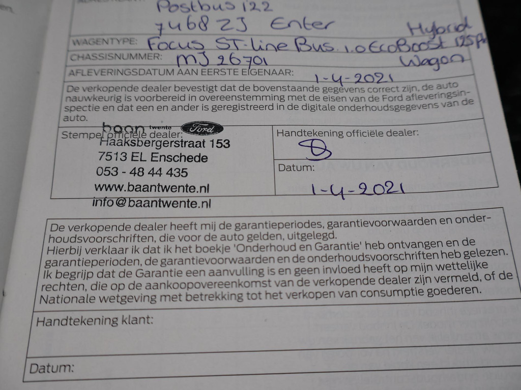 Origineel Nederlandse en 1e eigenaar auto, BTW verrekenbaar, 1.0 EcoBoost Hybrid 125 PK met 6 versnellingen, ST LINE Business uitvoering met ST Line Sportbumpers, velgen en achterspoiler, Sportstoelen met rood stiksel, Leder sportstuur met rood stiksel, ST Line dorpellijsten aluminium, Zwarte hemelbekleding, Navigatie Ford groot scherm touch-screen, Apple Carplay / Android Auto appstreaming Google Maps, Flitsmeister, Whatsapp, Spotify etc, Achteruitrijcamera, Trekhaak, Climate control, Elektrisch inklapbare buitenspiegels, Cruise control, Draadloze telefoonlader, Lijnassistentie, Privacy glass, DAB+ Digitale radio, Bluetooth met audiostreaming, Keyless-entry en keyless-drive, Agathe black metallic.