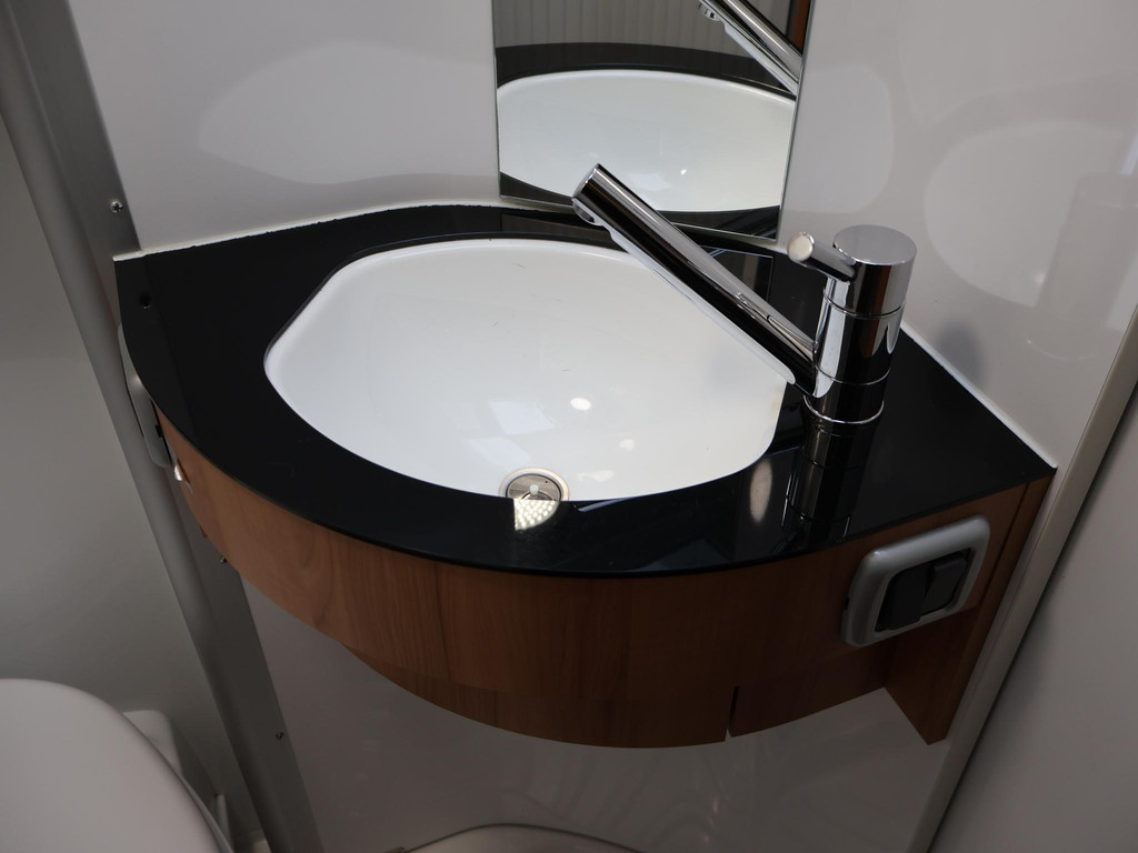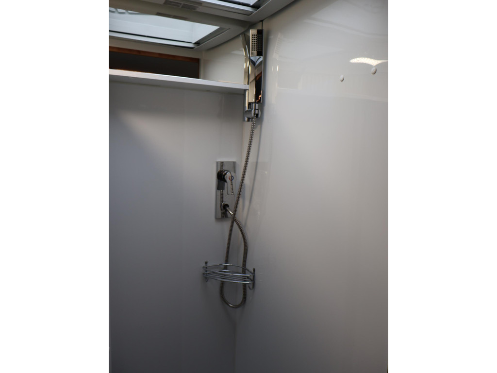 De wc/doucheruimte in de Summit 640 is slim verdeeld in twee ruimtes: een wastafel met wc en een douche. Dankzij de innovatieve draaiende zwenkwand kunt u de ruimtes eenvoudig omtoveren. Deze doordachte indeling zorgt voor optimale benutting van de ruimte en biedt maximaal gebruiksgemak.