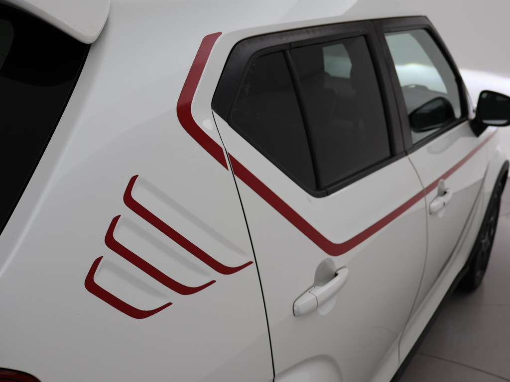 1.2 Smart Hybrid in de Stijl uitvoering, Wit met rode striping en rode interieur accenten, Achteruitrijcamera, Navigatie, Climate control, Keyless-entry en keyless-drive, Lichtmetalen velgen, Elektrische ramen voor + achterin, Cruise control, Het interieur heeft wat verfsporen.