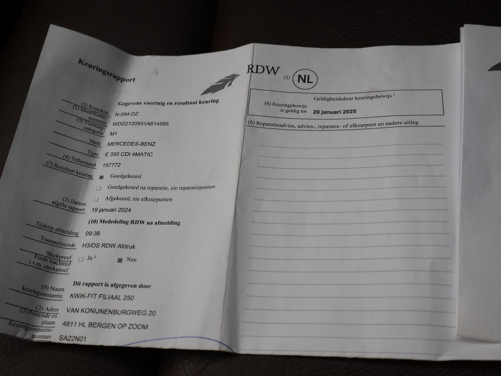 E-klasse 350 CDI V6 diesel 265 PK Automaat 4-matic vierwielaandrijving, Avantgarde uitvoering in de exterieurkleur Pearl beige metallic met interieur leather brown en dashboard inleg Designo wood burred walnut veneer. Zwarte hemelbekleding, Lichtmetalen velgen, Dubbele uitlaat, Trekhaak met 2100 kg trekgewicht, Comand navigatie, Cruise control, Xenon verlichting, Stoelverwarming, Climate control, Elektrisch zonnescherm voor de achterruit, Tot en met 2021 alle onderhoudsbeurten bij de Mercedes-Benz dealer uitgevoerd en online in DSB bij Mercedes-Benz bijgehouden. Daarna universeel onderhouden. Er zit een lakbeschadiging bovenop de achterbumper en op het linkerachterscherm.