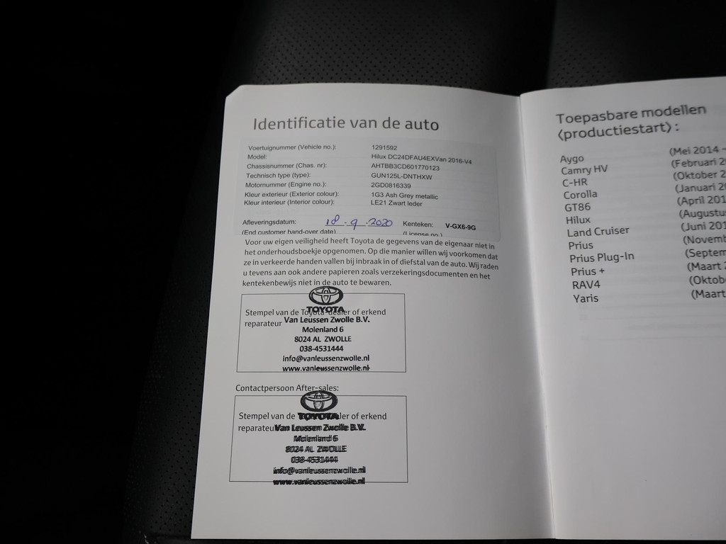 Unieke HiLux: Origineel Nederlandse en 1e eigenaar auto, Volledig Toyota dealer onderhouden, 4x onderhoud gehad, Slechts 42.151 km gereden, Double Cab dus 4 deurs uitvoering, maar gezien de grijs kenteken eisen in Nederland 2 zitplaatsen gemonteerd en op kenteken, tussenschot met ruit achter de 2 stoelen, De achterbank is wel los aanwezig. Donkergrijs metallic met zwart volledig leder interieur, Executive uitvoering, 2.4 D-4D 150 PK Automaat 4X4 met 18 inch lichtmetalen velgen, Elektrische stoelverstelling, Adaptive cruise control, Treeplanken, Full LED koplampen met LED dagrijverlichting, Achteruitrijcamera, Navigatie, Climate control, Bluetooth met audiostreaming, DAB+ digitale radio, Keyless-entry en keyless-drive, Hardcover bed/cover over de laadruimte, Trekhaak met 3050 kg trekgewicht op kenteken, Rollbar achter de achterruit, Privacy glass, Zwarte hemelbekleding, Mistlampen, Zwarte buitenspiegels en portiergrepen, Buitenspiegels elektrisch inklapbaar, Lijnassistentie, Prijs is exclusief BTW.