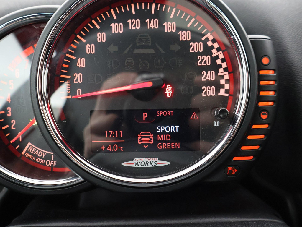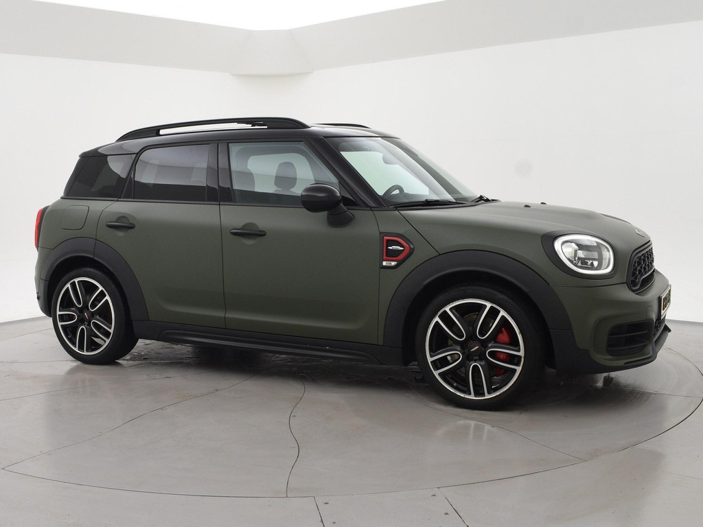 Mini Countryman John Cooper Works (JCW) Chili 2.0 All4 231 PK automaat, RDW nieuwprijs 63.474 euro, Mat groen gewrapt (fabriekskleur onder de wrap = Melting Silver metallic, een taupebeige kleur). Zwart volledig leder sportinterieur met stoelverwarming, Panorama schuif/kanteldak, Uitgebreide sfeerverlichting interieur met verschillende kleuren, Breedbeeld Navigatie, Harman/Kardon premium sound, Achteruitrijcamera, Head-up display, Elektronische voorruitverwarming, DAB+ digitale radio, Bluetooth met audiostreaming, 19 inch lichtmetalen velgen, Zwarte hemelbekleding, Dakrailing, Privacy glass, Full LED Koplampen, LED achterlichten, Grotere brandstoftank, Adaptief onderstel, JCW leder sportstuurwiel, Comfort access keyless-entry en keyless-drive, Isofix, Mini Driving Modes regelbare rij-eigenschappen met sport modus, Cruise control, Climate control, Parkeersensoren, Schakelflippers aan het stuurwiel, Britse vlag in de hoofdsteunen verwerkt, Elektrisch inklapbare buitenspiegels.