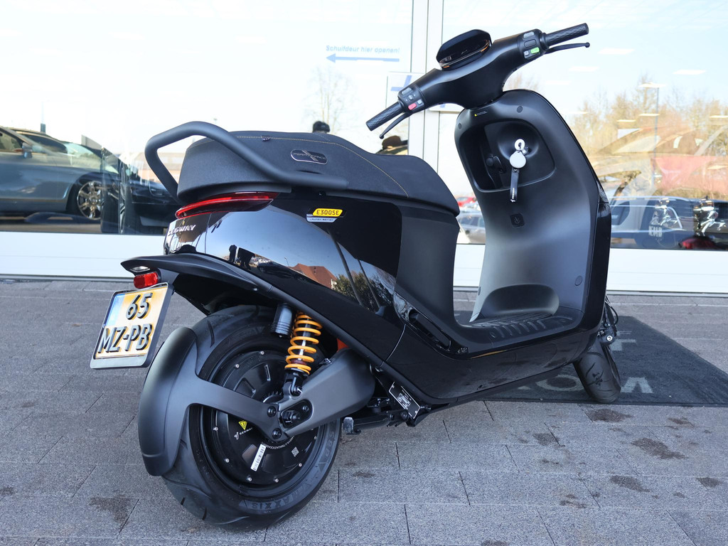 Nieuwe nog ongeregistreerde Segway motorscooter, model E300SE Performance in het Phantom Black, 100 km/h motorscooter, Volledig elektrisch, Prijs is inclusief BTW, Ledig gewicht 94 kg, 10 kW vermogen, 6 km op de teller, Fabrikant Segway-Ninebot, Constructiesnelheid op kenteken = 105 km/h, Cruise control, ABS Van 0-50 km/h in 2,9 seconden.