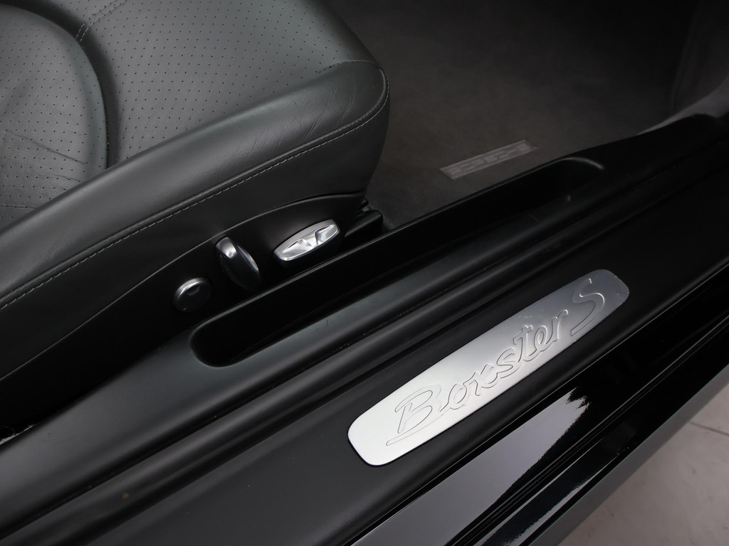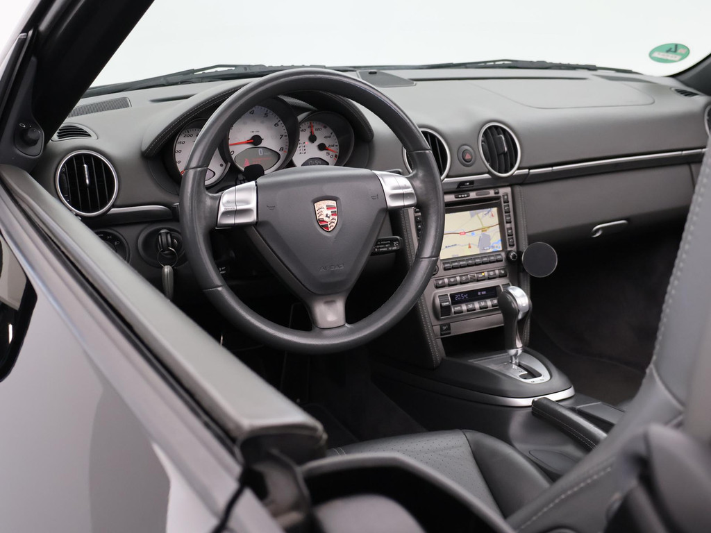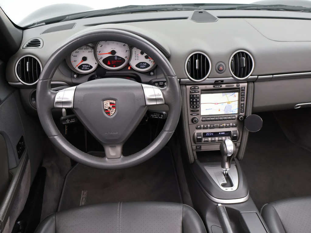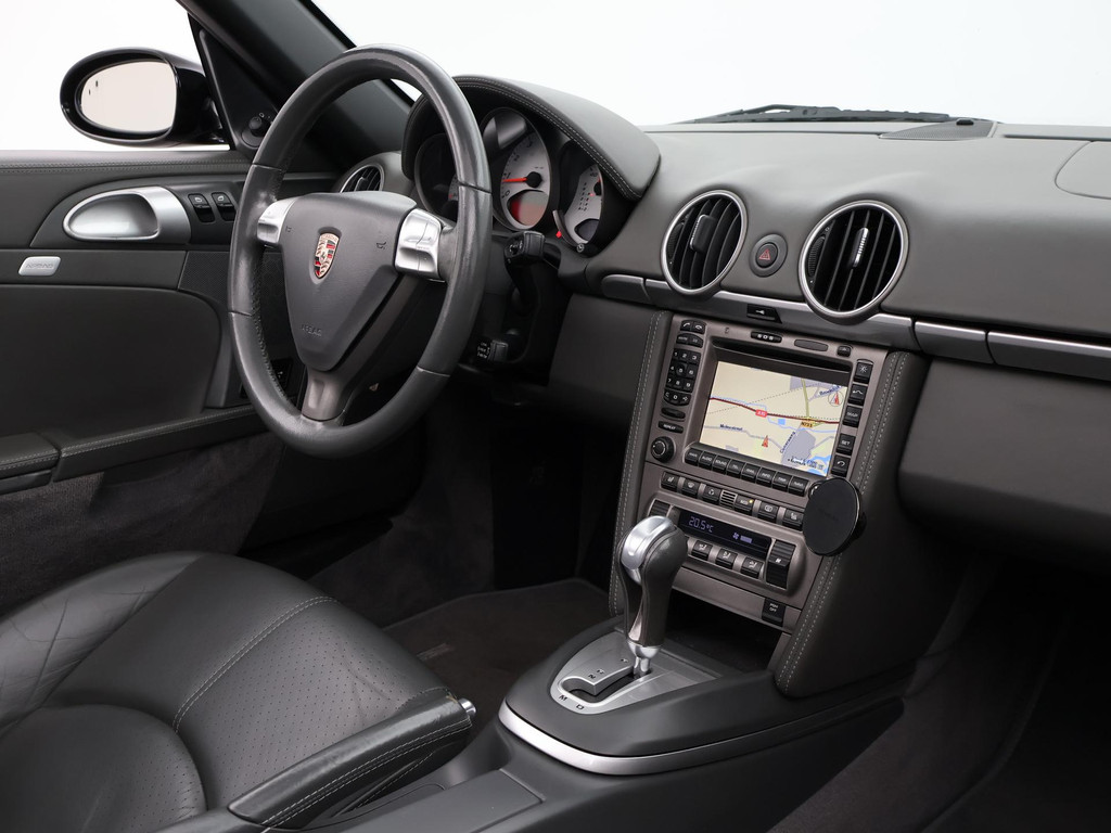 Boxter S met de 3.2 280 PK motor, Tiptronic automaat, Originele boekjes en complete onderhoudshistorie aanwezig, Zwart met grijs volledig leder interieur, Elektrische stoelverstelling met geheugen, Stoelverwarming, Navigatie, Bi-Xenon koplampen, Hoogglans zwarte 19 inch lichtmetalen velgen, Rode remklauwen, Cruise control, Climate control, Elektrische achterspoiler, Zij-airbags, Lederen afwerking in de deurpanelen en middentunnel, Lederen afwerking rondom de tellers, Witte tellerplaten, Boardcomputer, Zwarte elektrische softtop cabriokap.