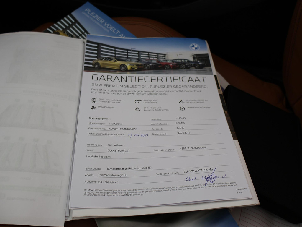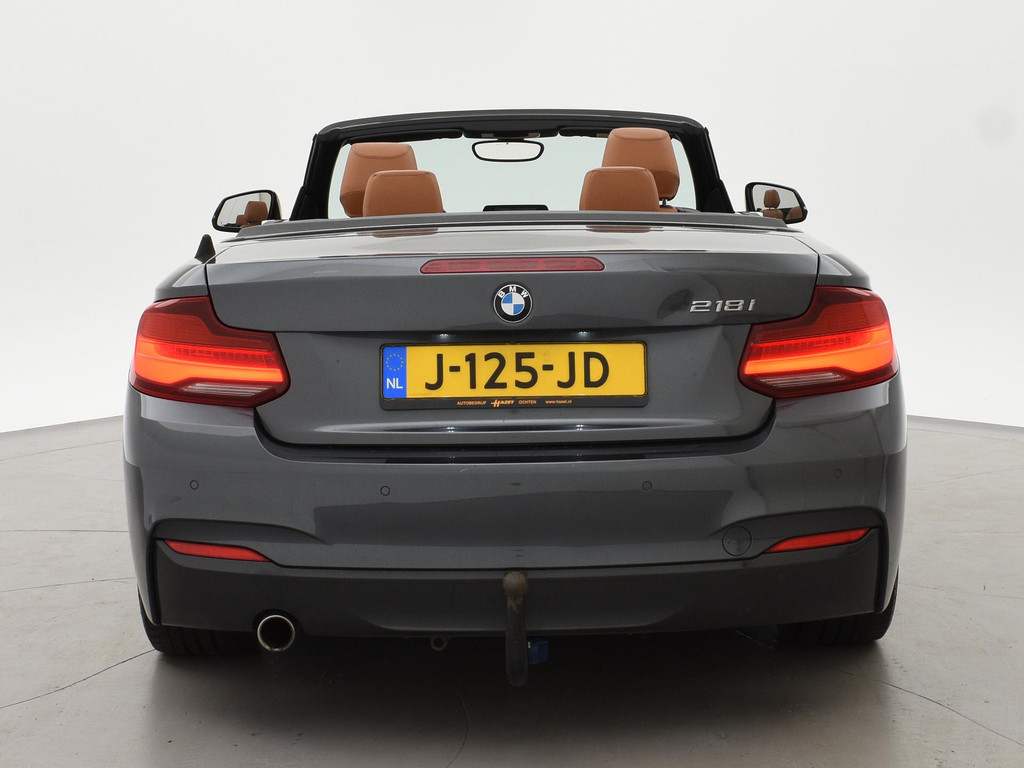 218I Cabrio Automaat, High Executive uitvoering, Mineralgrau metallic met cognac volledig leder sportinterieur met verlengbaar zitvlak met stoelverwarming, Afneembare Trekhaak, M-Sportstuurwiel, Blauwe dashboard inleg, Navigatie, Climate control, LED Koplampen, LED achterlichten, Parkeersensoren voor en achter, Windscherm, Cruise control.