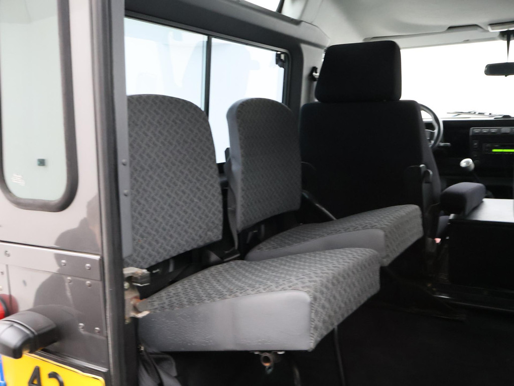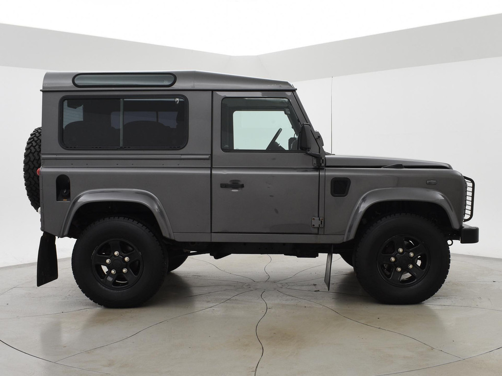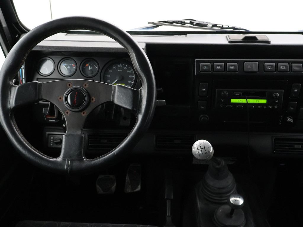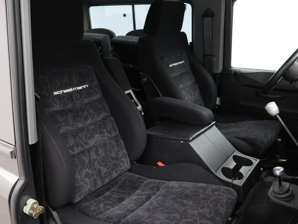 Defender 90" met 6 zitplaatsen dus geel kenteken, Donkergrijs metallic, Scheel-Mann sportstoelen voorin, Leder sportstuurwiel, Airco, Webasto Standkachel, Zwarte lichtmetalen velgen, Koplampbeschermers, Elektrische ramen, Aluminium pook voor de versnellingsbak en de tussenbak, 2.5 TD5 5-cilinder 4X4.