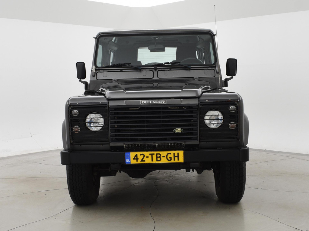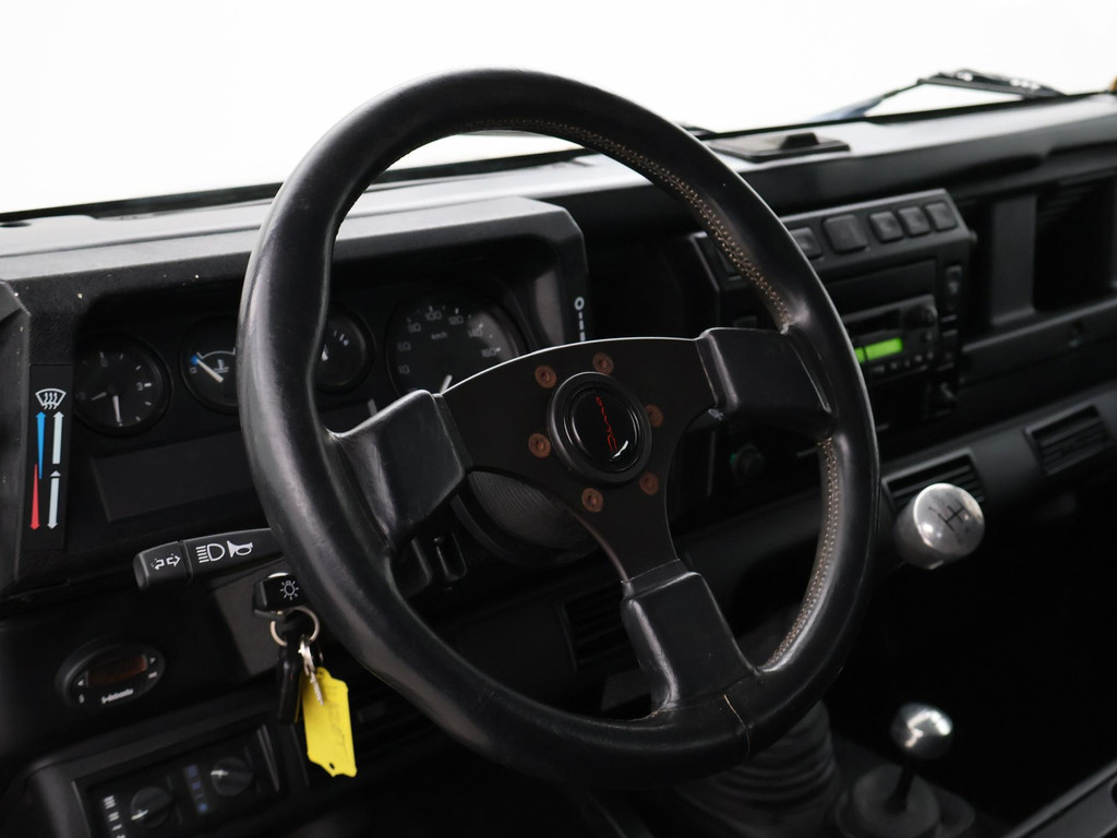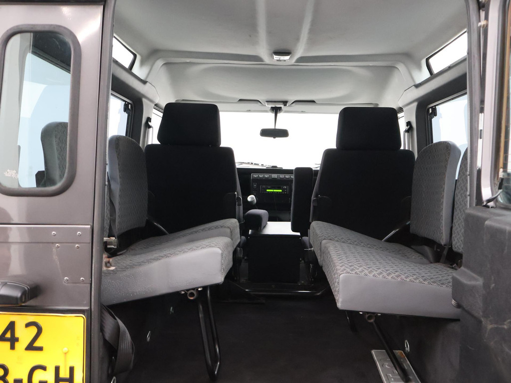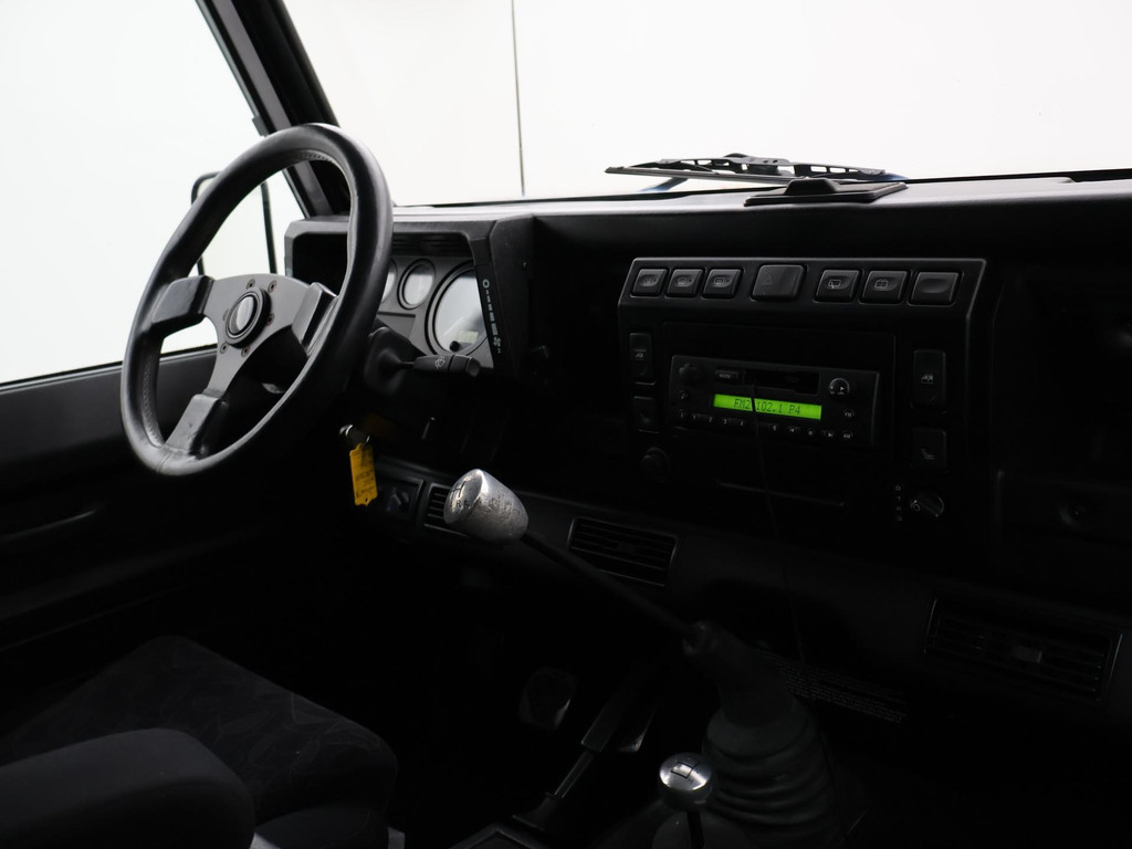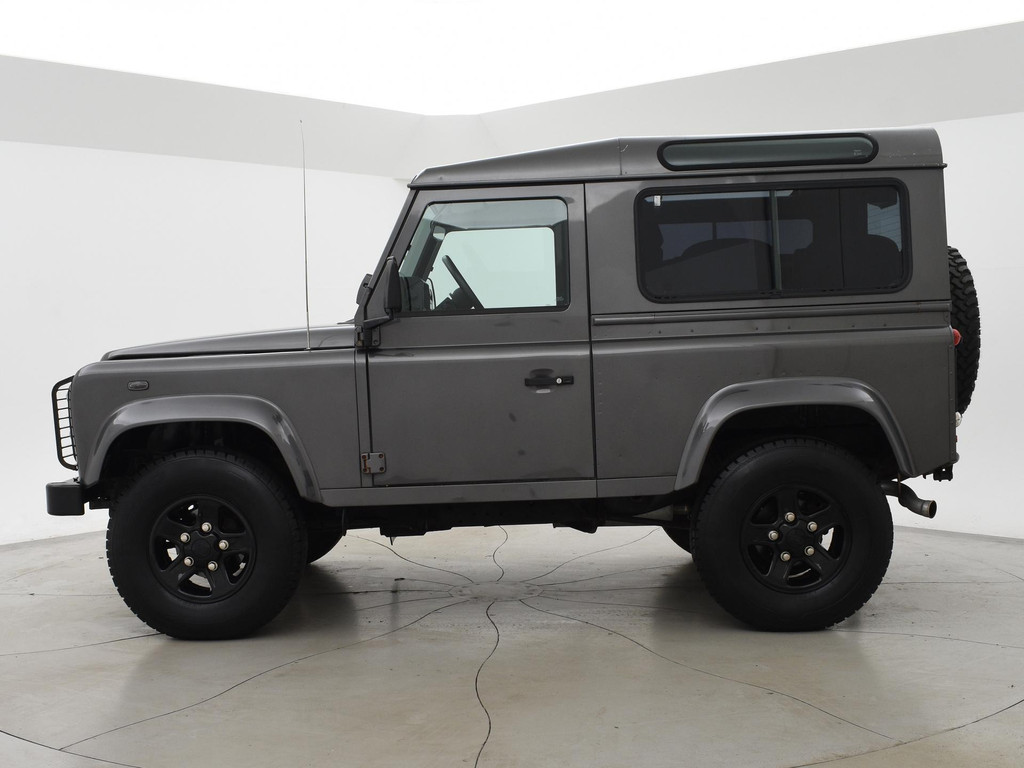 Defender 90" met 6 zitplaatsen dus geel kenteken, Donkergrijs metallic, Scheel-Mann sportstoelen voorin, Leder sportstuurwiel, Airco, Webasto Standkachel, Zwarte lichtmetalen velgen, Koplampbeschermers, Elektrische ramen, Aluminium pook voor de versnellingsbak en de tussenbak, 2.5 TD5 5-cilinder 4X4.