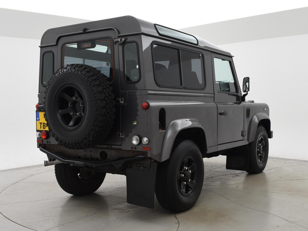Defender 90" met 6 zitplaatsen dus geel kenteken, Donkergrijs metallic, Scheel-Mann sportstoelen voorin, Leder sportstuurwiel, Airco, Webasto Standkachel, Zwarte lichtmetalen velgen, Koplampbeschermers, Elektrische ramen, Aluminium pook voor de versnellingsbak en de tussenbak, 2.5 TD5 5-cilinder 4X4.