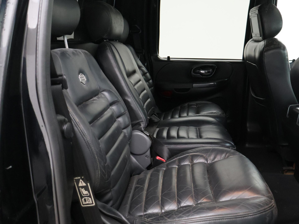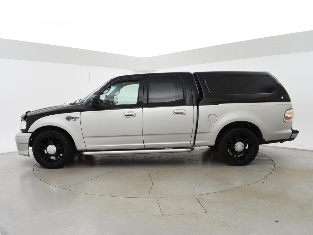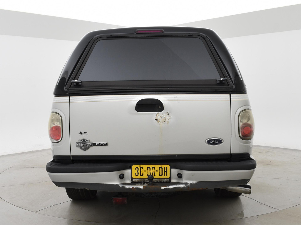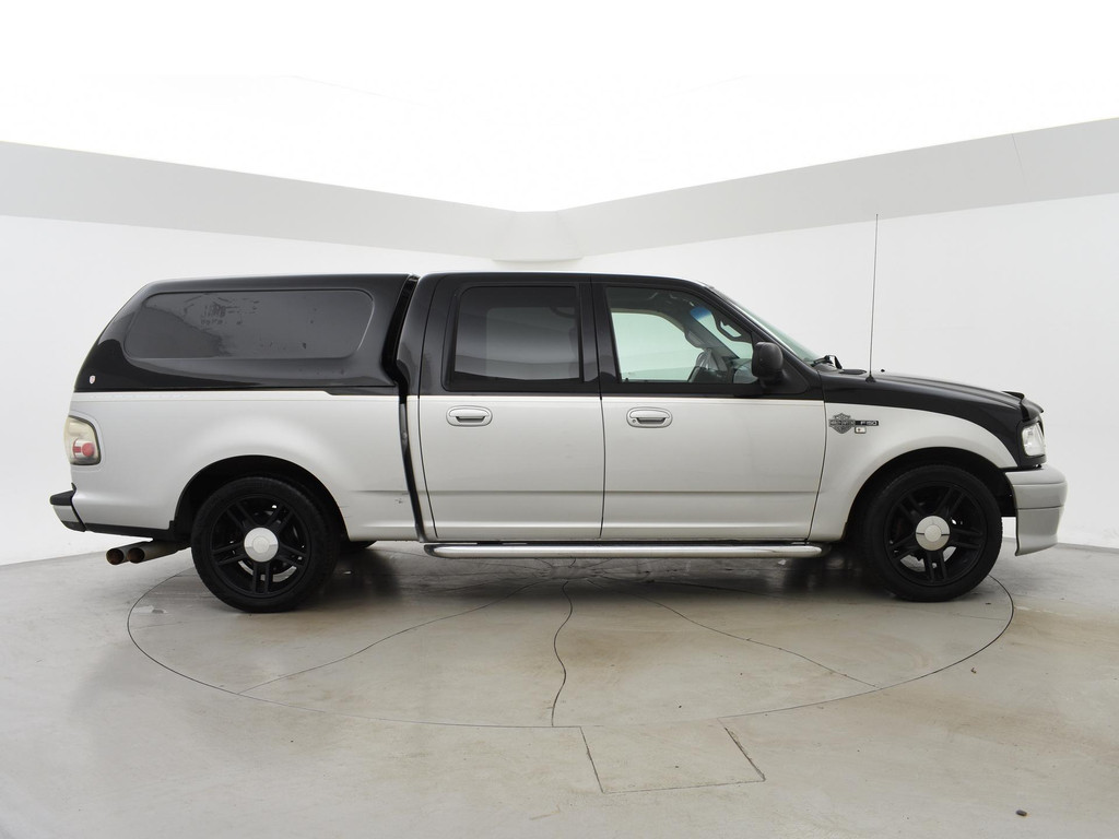 F150 Supercab dubbel cabine uitvoering in de Harley Davidson uitvoering met Bi-color zilver/zwart exterieurstyling en zwart leder interieur met Harley Davidson logo's, 133.020 mijlen gereden, Marge auto dus geen bijkomende BTW, 5.4 V8 benzinemotor met LPG installatie, Diverse roestplekken rondom, APK tot 19-12-2025. Hoofdsteun bijrijder afgebroken, Radio werkt niet, Youngtimer met aanschafwaarde bijtelling bij zakelijke aanschaf, Stoelverwarming, Schuif/kanteldak, Elektrische stoelverstelling, Cruise control, 20 inch lichtmetalen velgen, Airco, Hardtop over de laadruimte, Zwarte hemelbekleding, Trekhaak.
