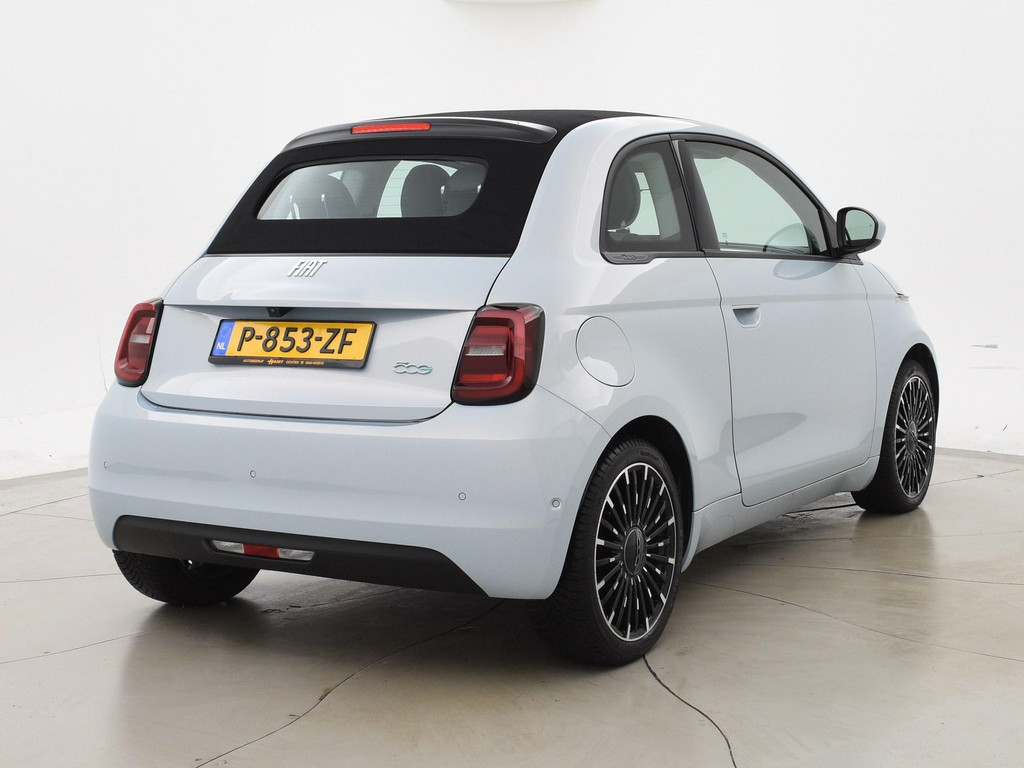 Fiat 500e cabrio / 500C 42 kWh in de super gave kleur Celestial Blue, Zeer compleet met breedbeeld navigatie + digitale cockpit met navigatie kaartweergave, Stoelverwarming, Draadloze Apple Carplay appstreaming, 17 inch lichtmetalen velgen, Achteruitrijcamera, Climate control, Leder stuurwiel, LED dagrijverlichting, LED achterlichten, Bluetooth, DAB+ digitale radio, Cruise control.
