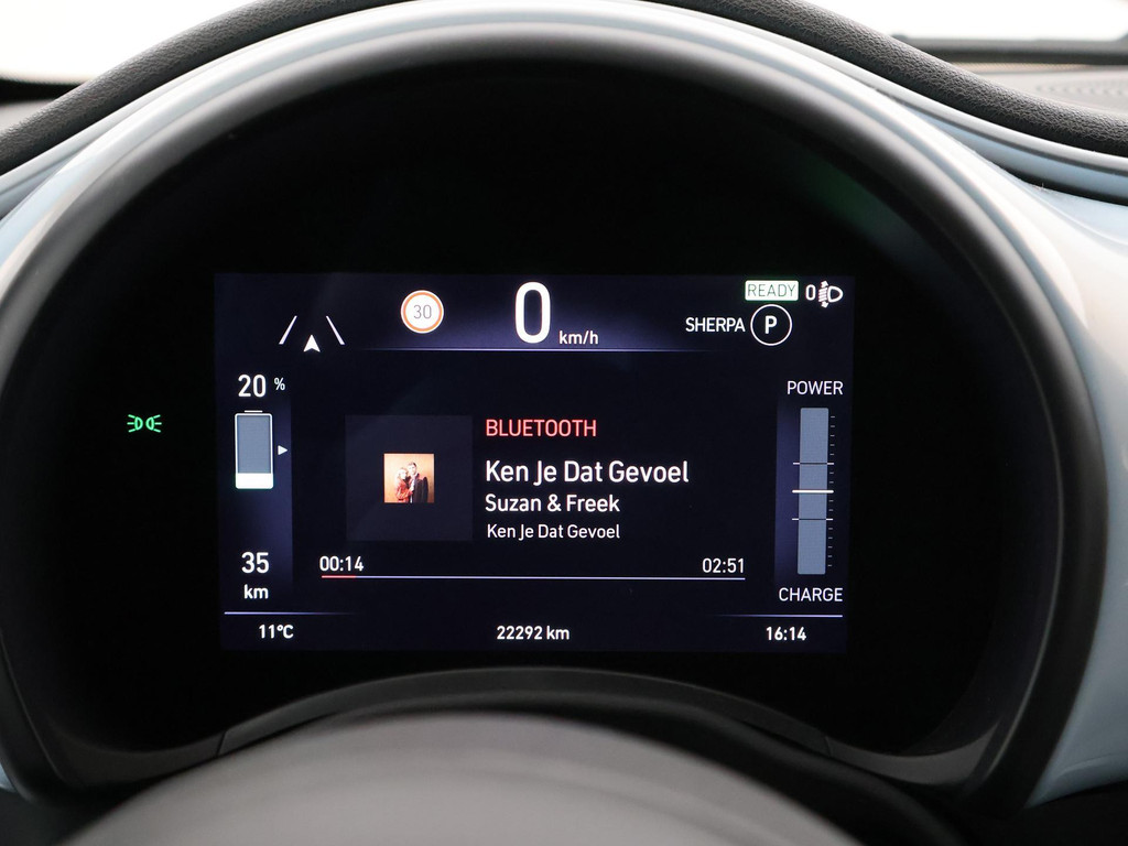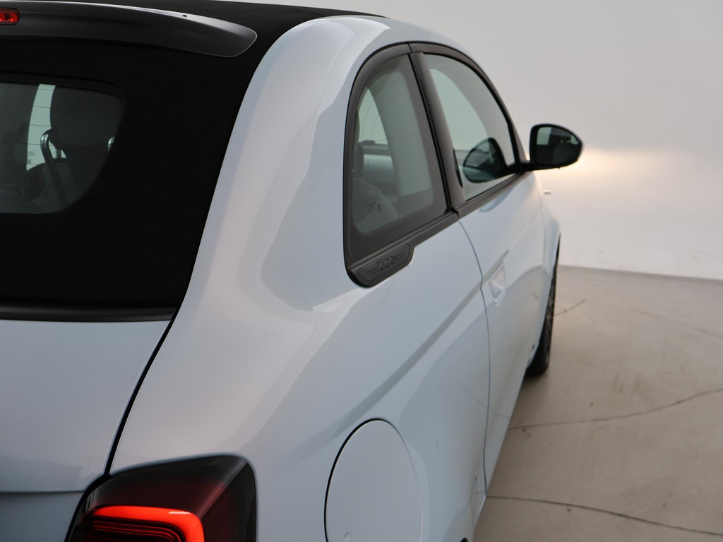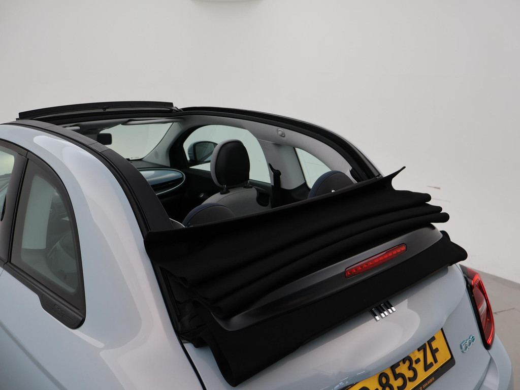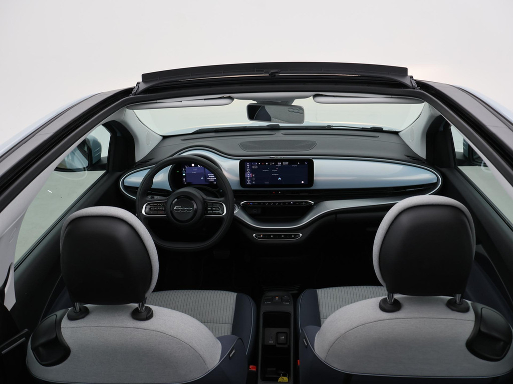 Fiat 500e cabrio / 500C 534 kWh in de super gave kleur Celestial Blue, Zeer compleet met breedbeeld navigatie + digitale cockpit met navigatie kaartweergave, Stoelverwarming, Draadloze Apple Carplay appstreaming, 17 inch lichtmetalen velgen, Achteruitrijcamera, Climate control, Leder stuurwiel, LED dagrijverlichting, LED achterlichten, Bluetooth, DAB+ digitale radio, Cruise control.