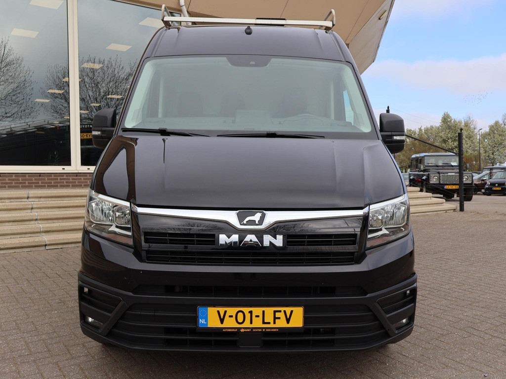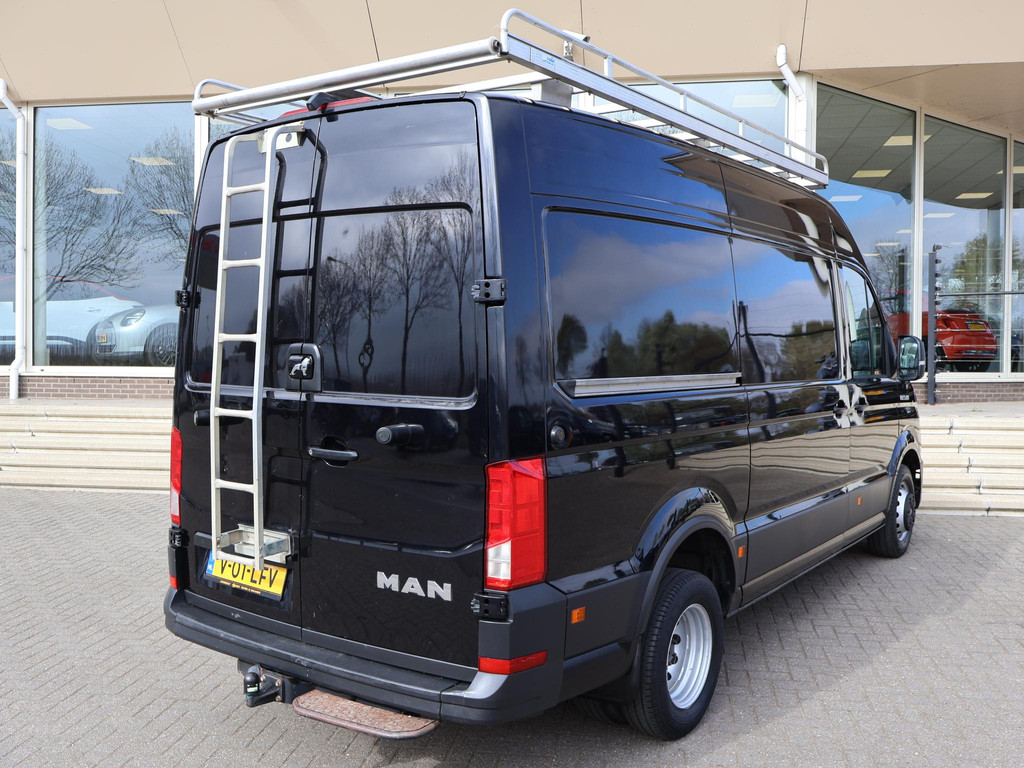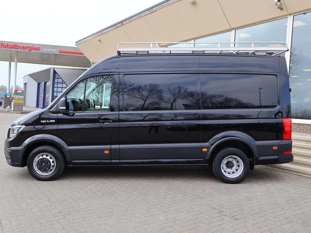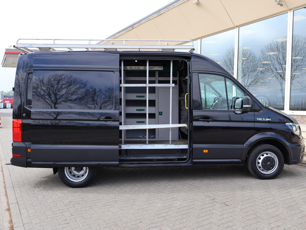 MAN TGE 5.180 dus de 5 tons uitvoering met dubbel lucht achter met 3500 kg trekgewicht op kenteken en de bus zelf ook teruggekeurd naar 3500 kg dus gewoon B-rijbgewijs. 2.0 TDI 180 PK Automaat, L3H3 in het zwart met 3 zitplaatsen, Geveerde comfort chauffeursstoel met verlengbaar zitvlak, Achteruitrijcamera, Navigatie, Apple Carplay / Android Auto appstreaming Google Maps, Flitsmeister, Whatsapp etc, Werkplaatsinrichting in de laadruimte met kasten en 230V omvormer, Imperiaal met ladder, Climate control met links en rechts gescheiden temperatuur, Cruise control, Multifunctioneel stuurwiel, 331 cm laadlengte, Prijs is exclusief BTW.