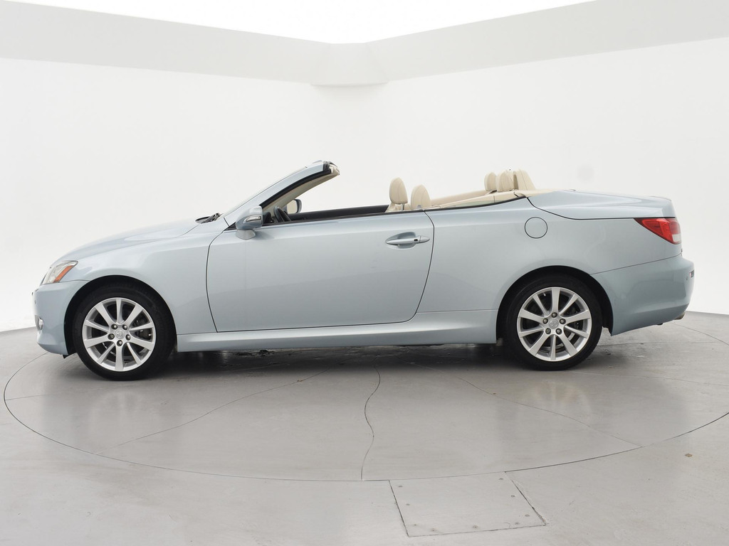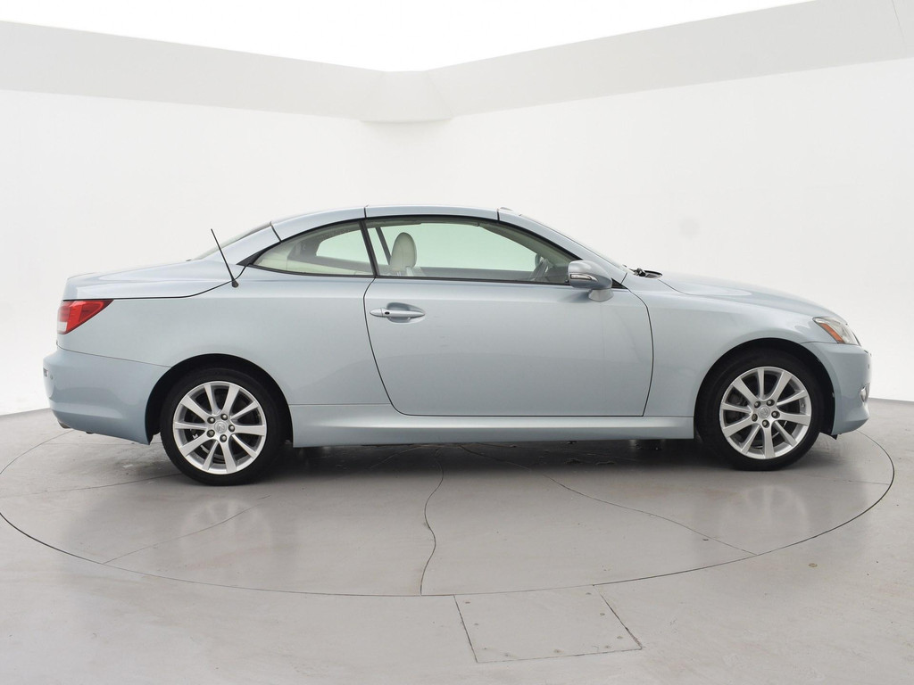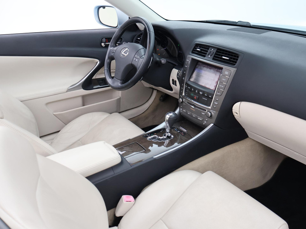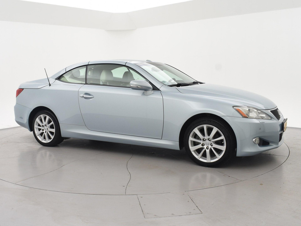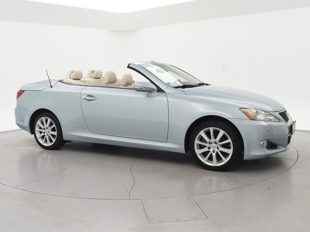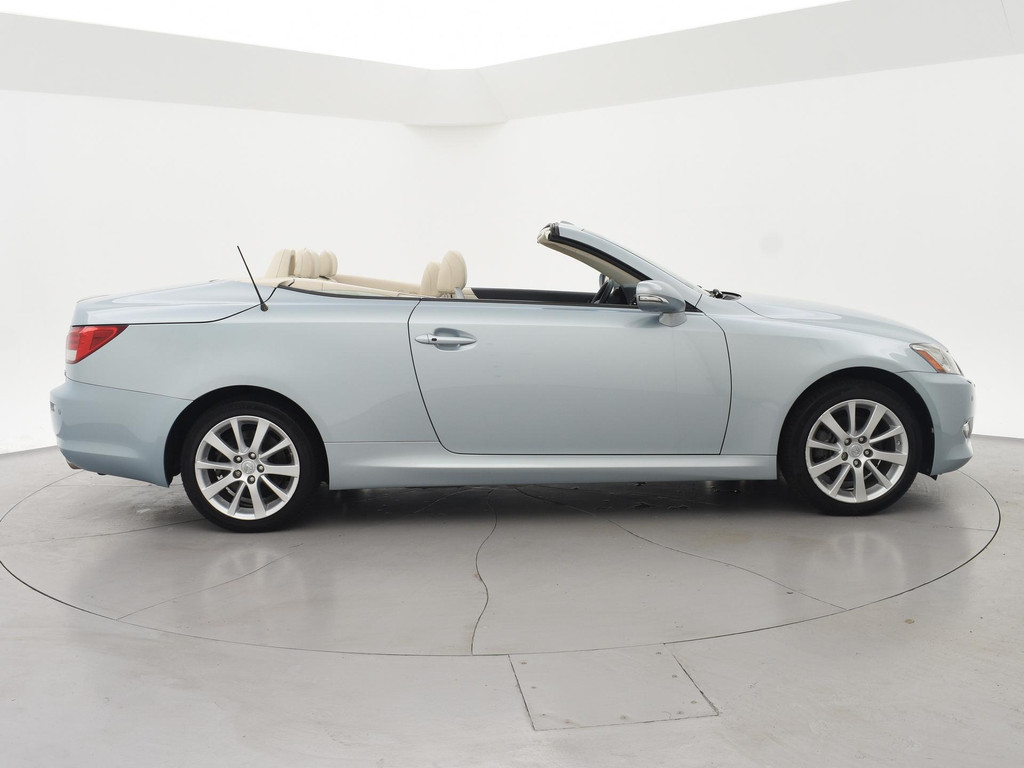 Unieke auto: IS 250C 2.5 V6 208 PK Automaat Cabriolet, Lichtblauw metallic met beige volledig leder interieur, Stoelventilatie, Stoelverwarming, Elektrische stoelverstelling met geheugen, Cruise control, Mistlampen, Elektrisch verstelbaar stuurwiel, Leder stuurwiel met audiobediening, Automatisch dimmende binnenspiegel, Keyless-entry en keyless-drive, Elektrische cabriokap, 6CD-wisselaar, Navigatie wel aanwezig, maar functioneert niet, omdat deze auto nieuw geleverd is in Amerika. De auto reed daar bij een Nederlandse diplomaat die de auto als verhuisgoed mee naar Nederland heeft genomen. Carfax aanwezig waarin te zien is dat de auto een diplomaten registratie had in Amerika en geen schadeverleden. De tellerstand 112.345 is in mijlen, omgerekend naar kilometers is dit 180.802 km.