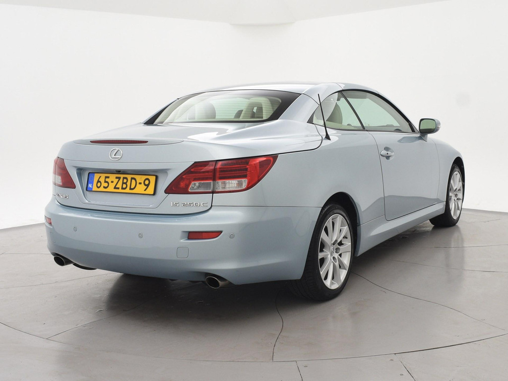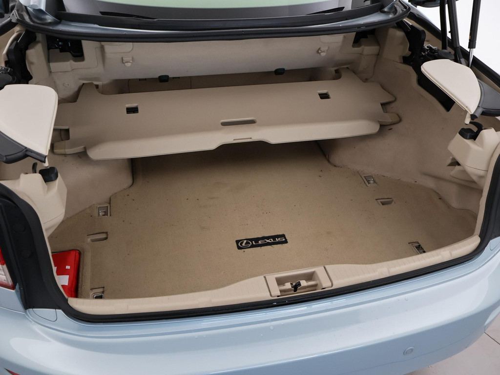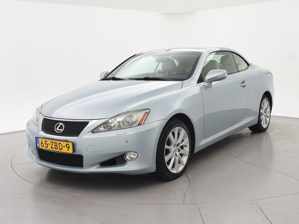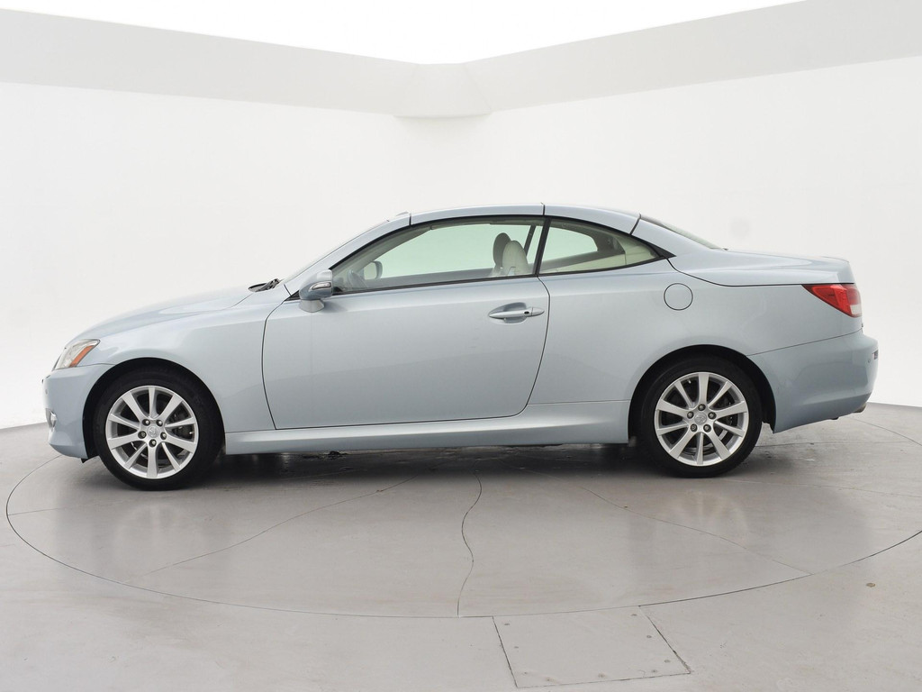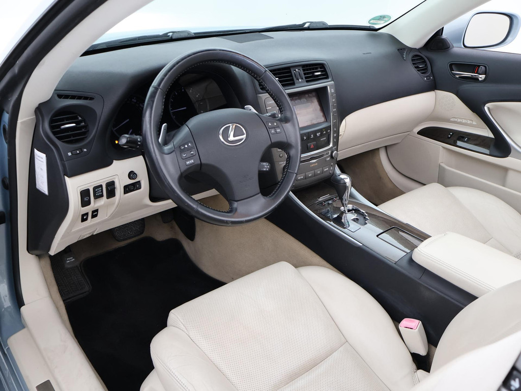 Unieke auto: IS 250C 2.5 V6 208 PK Automaat Cabriolet, Lichtblauw metallic met beige volledig leder interieur, Stoelventilatie, Stoelverwarming, Elektrische stoelverstelling met geheugen, Cruise control, Mistlampen, Elektrisch verstelbaar stuurwiel, Leder stuurwiel met audiobediening, Automatisch dimmende binnenspiegel, Keyless-entry en keyless-drive, Elektrische cabriokap, 6CD-wisselaar, Navigatie wel aanwezig, maar functioneert niet, omdat deze auto nieuw geleverd is in Amerika. De auto reed daar bij een Nederlandse diplomaat die de auto als verhuisgoed mee naar Nederland heeft genomen. Carfax aanwezig waarin te zien is dat de auto een diplomaten registratie had in Amerika en geen schadeverleden. De tellerstand 112.345 is in mijlen, omgerekend naar kilometers is dit 180.802 km.