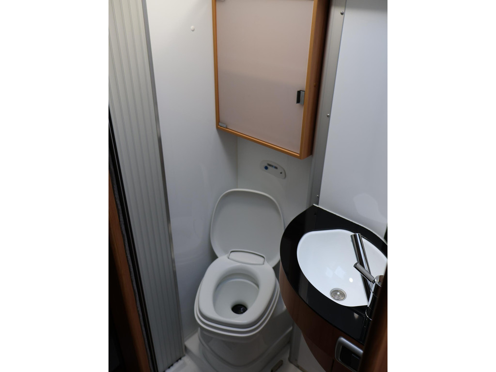 De wc/doucheruimte in de Summit 640 is slim verdeeld in twee ruimtes: een wastafel met wc en een douche. Dankzij de innovatieve draaiende zwenkwand kunt u de ruimtes eenvoudig omtoveren. Deze doordachte indeling zorgt voor optimale benutting van de ruimte en biedt maximaal gebruiksgemak.