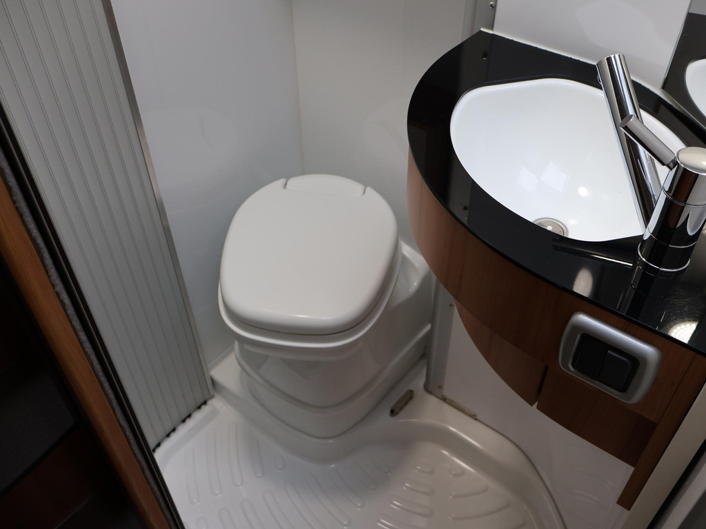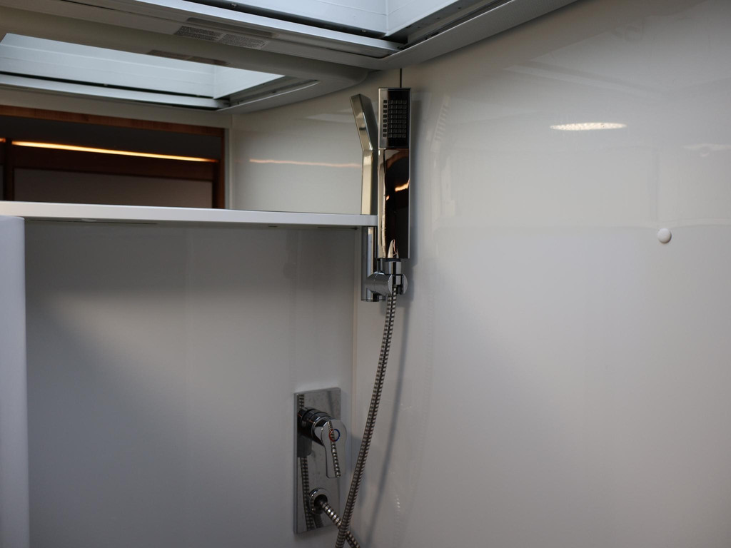 De wc/doucheruimte in de Summit 640 is slim verdeeld in twee ruimtes: een wastafel met wc en een douche. Dankzij de innovatieve draaiende zwenkwand kunt u de ruimtes eenvoudig omtoveren. Deze doordachte indeling zorgt voor optimale benutting van de ruimte en biedt maximaal gebruiksgemak.