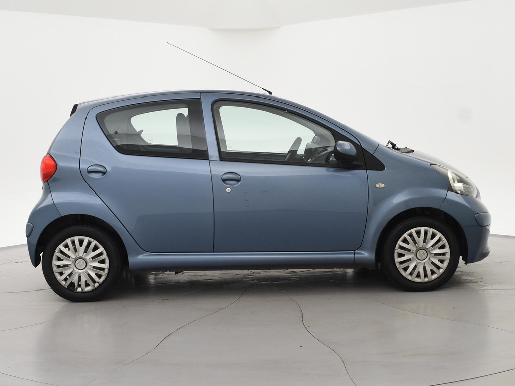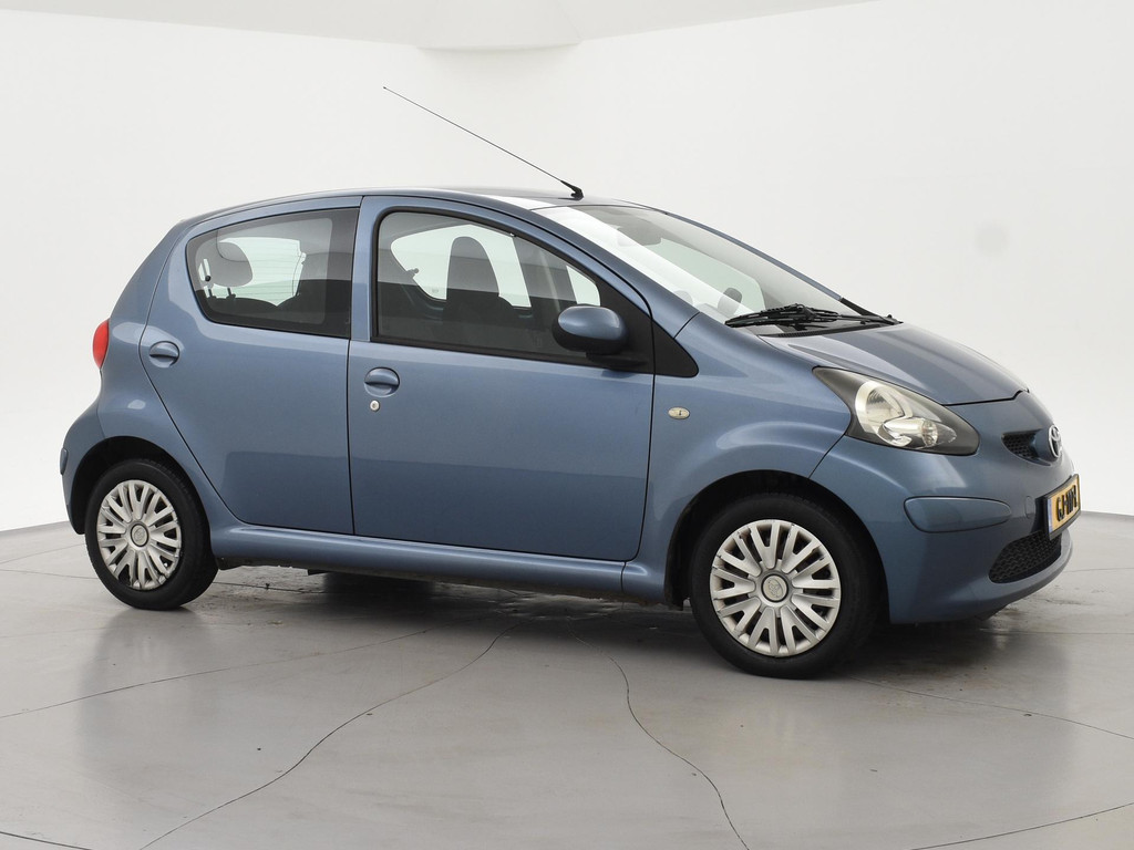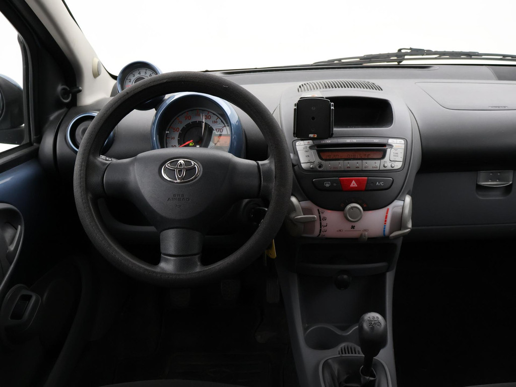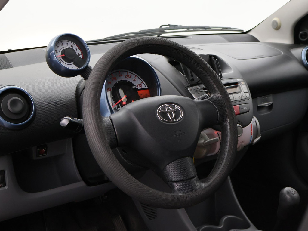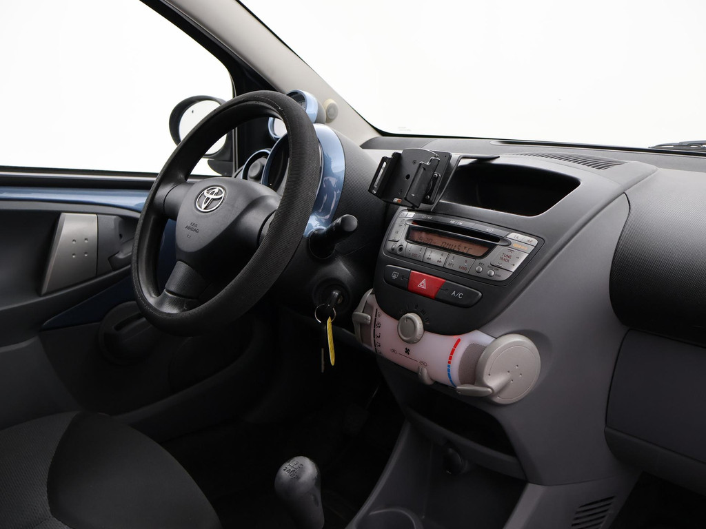 5-deurs Toyota Aygo 1.0 12V in het Pacific Blue metallic met Airco, Elektrische ramen, Toerenteller, Radio/CD met Aux aansluiting, Centrale deurvergrendeling op afstandsbediening, Stuurbekrachtiging, Zwart interieur, hiervan is wel de instap van het zitvlak versleten.