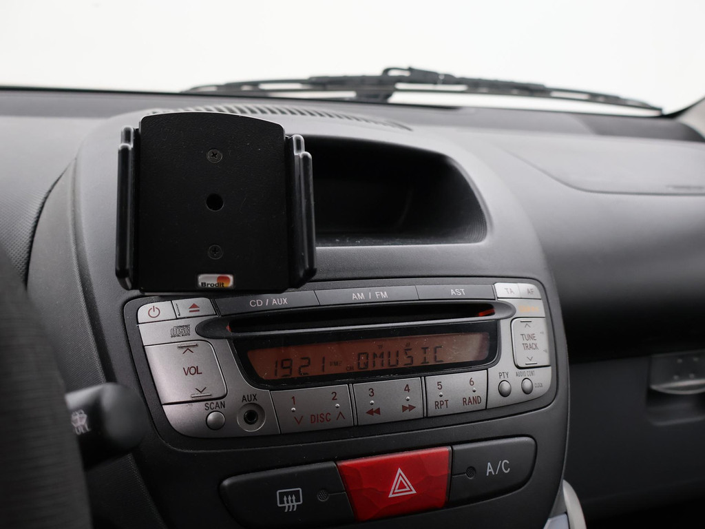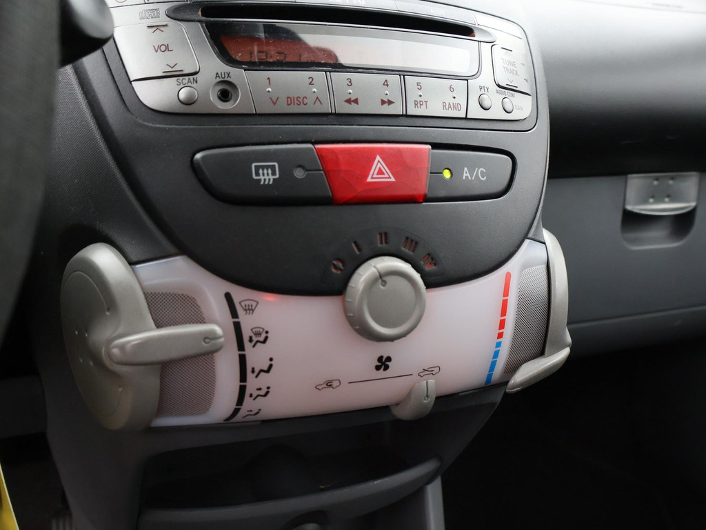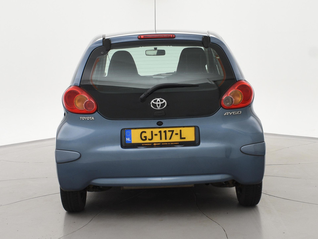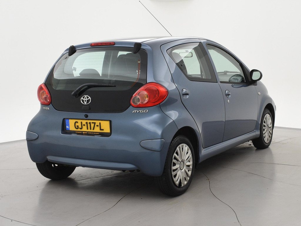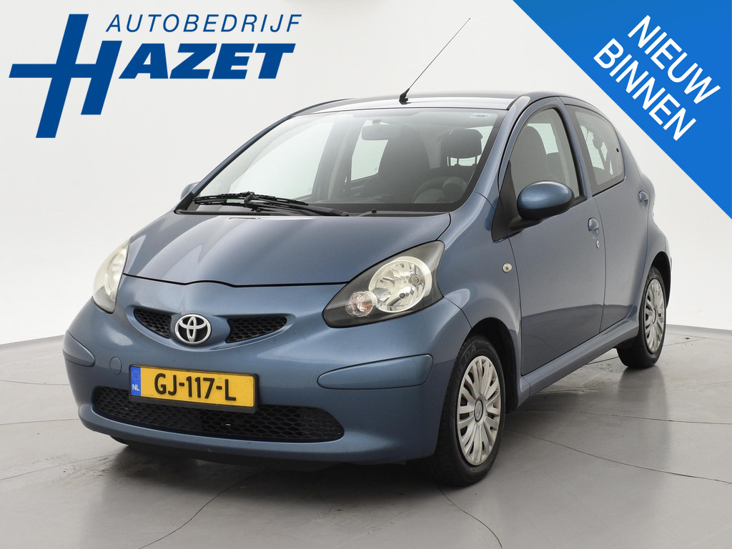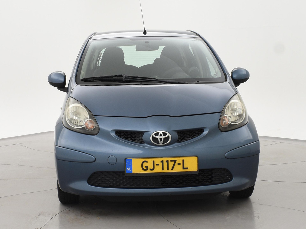 5-deurs Toyota Aygo 1.0 12V in het Pacific Blue metallic met Airco, Elektrische ramen, Toerenteller, Radio/CD met Aux aansluiting, Centrale deurvergrendeling op afstandsbediening, Stuurbekrachtiging, Zwart interieur, hiervan is wel de instap van het zitvlak versleten.