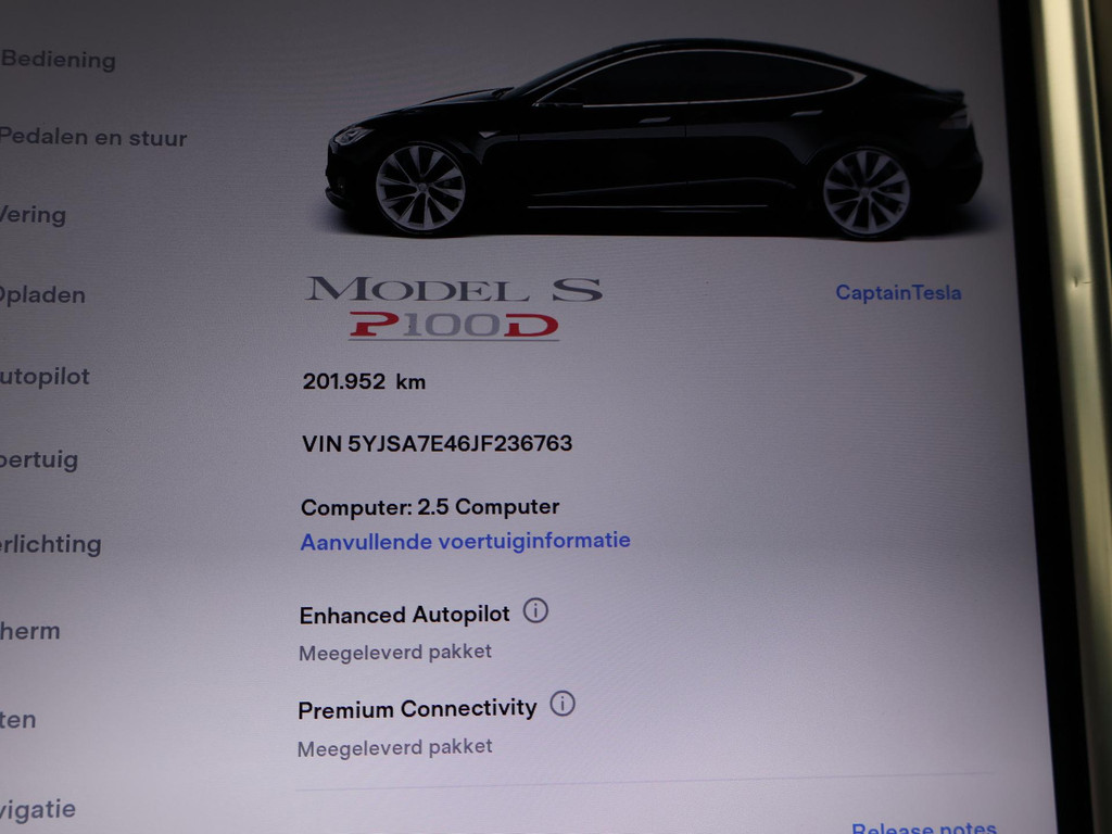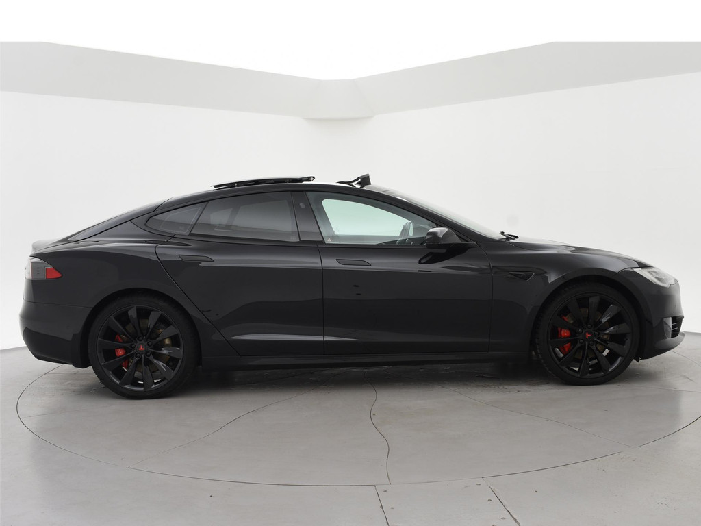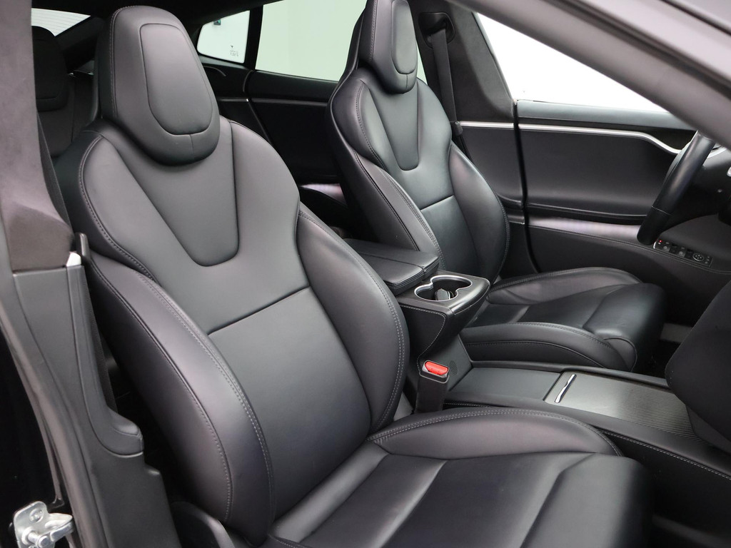 Model S 100D met de 100 kWh accu in de Performance uitvoering met 612 PK in plaats van de standaard 418 PK die de gewone 100D heeft. 613 km actieradius volgens fabrieksopgave, RDW nieuwprijs 162.450 euro, Zwart met zwart leder interieur en zwarte alcantara hemelbekleding, Rode Tesla logo's, Verbeterde Autopilot Enhanced Autopilot 2.5, Stuurwielverwarming, Stoelverwarming voor + achterin, 21 inch hoogglans zwarte velgen, Panorama schuif/kanteldak elektrisch bedienbaar, Carbon interieur pakket met carbon dashboard inleg, Achteruitrijcamera, Spotify, Spelletjes en apps, Digitale radio, LED koplampen, LED achterlichten, Adaptive cruise control, Luchtvering met regelbare rijhoogte,