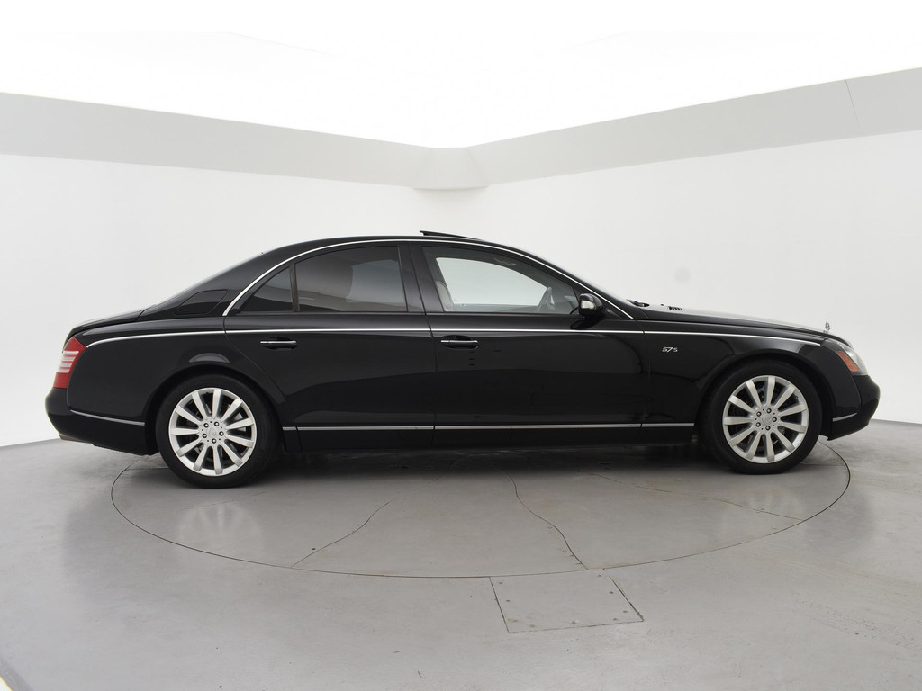 Maybach 57 6.0 V12S 612 PK Automaat, Unieke auto met een RDW Nieuwprijs van €589.600,- een ledig gewicht van 2635 kilo en een tankinhoud van maar liefst 110 liter, Eerste toelating van 02-2006 en voor die tijd extreem veel luxe, comfort en opties. Zo is de auto voorzien van onder ander: Adaptieve cruise control met regelbare afstand op de voorganger, Massagestoelen voor, Stoelverwaming en stoelventilatie voor + achter, Mediaschermen achterin, Koelkast in de middensteun achterin, Snelheidsmeter/temperatuurmeter/Maybach klok in de hemel, 20 Inch lichtmetalen velgen, Elektrisch schuif/kanteldak, Luchtvering met regelbare rijhoogte, Navigatiesysteem met kaartweergave, Multifunctioneel leder stuurwiel, 4-Zone climate control, Elektrische gordijnen achterin, Elektrische stoelverstelling met meerdere geheugenstanden, Bose premium sound, CD Wisselaar achterin, Dubbelglas, Solar roof, Zwarte alcantara hemelbekleding, Alle originele boekjes aanwezig met onderhoudshistorie uit Duitsland, Keyless entry + go, Elektrische achterklep, Maybach reparatie set, Elektrisch inklapbare buitenspiegels, Xenon verlichting, Carbon delen interieur, Elektrisch verstelbaar stuurwiel met stuurwielverwarming, Parkeersensoren voor + achter, Slechts 70.796 kilometer aantoonbaar op de teller.