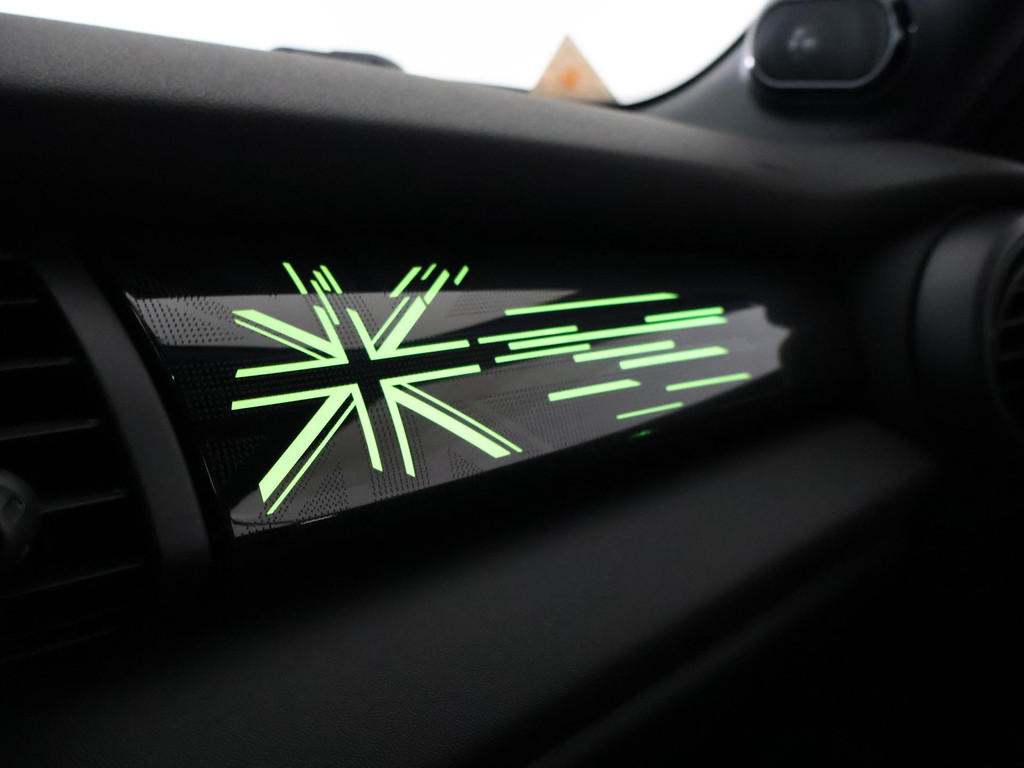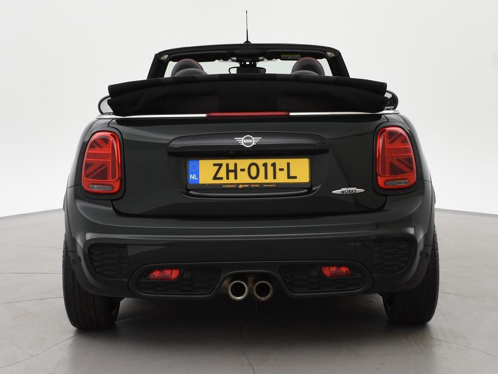 Origineel Nederlandse MINI Cabrio 2.0 John Cooper Works 231 PK automaat in het Rebel Green, RDW nieuwprijs 59.687 euro, Bijzonder compleet met JCW Sportstoelen, Adaptive cruise control, Harman/Kardon premium audio, Apple Carplay / Android Auto, Achteruitrijcamera, Keyless-entry en keyless-drive, Full LED koplampen en LED achterlichten, Zwarte striping met rode accenten, Stoelverwarming, Elektronische voorruitverwarming, DAB digitale radio, Bluetooth, Climate control, Sfeerverlichting interieur met verschillende kleuren, Rode grille en buitenspiegels, Union Jack achterlichten, Union Jack dashboard inleg.