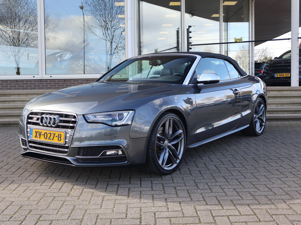 Audi S5 cabrio 3.0 TFSI 333 PK Quattro automaat met 7 versnellingen, Zwart leder interieur met stoelverwarming en verkoeling, Afneembare trekhaak met 1900 KG trekgewicht, Bang & Olufsen premium sound, Xenon met LED dagrijverlichting, Parkeersensoren voor + achter, Elektrische stoelverstelling, 20 inch lichtmetalen velgen, Bluetooth, S-line sportstuurwiel, Keyless-drive, Cruise control, Climate control.