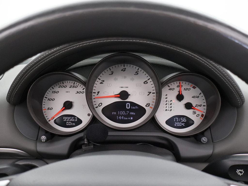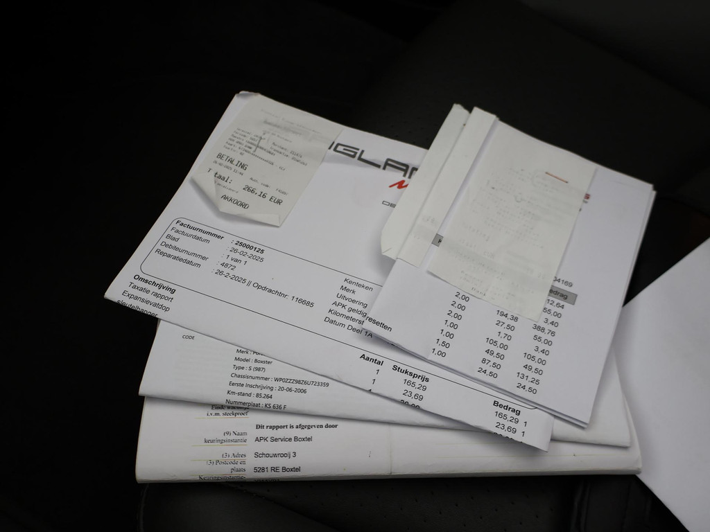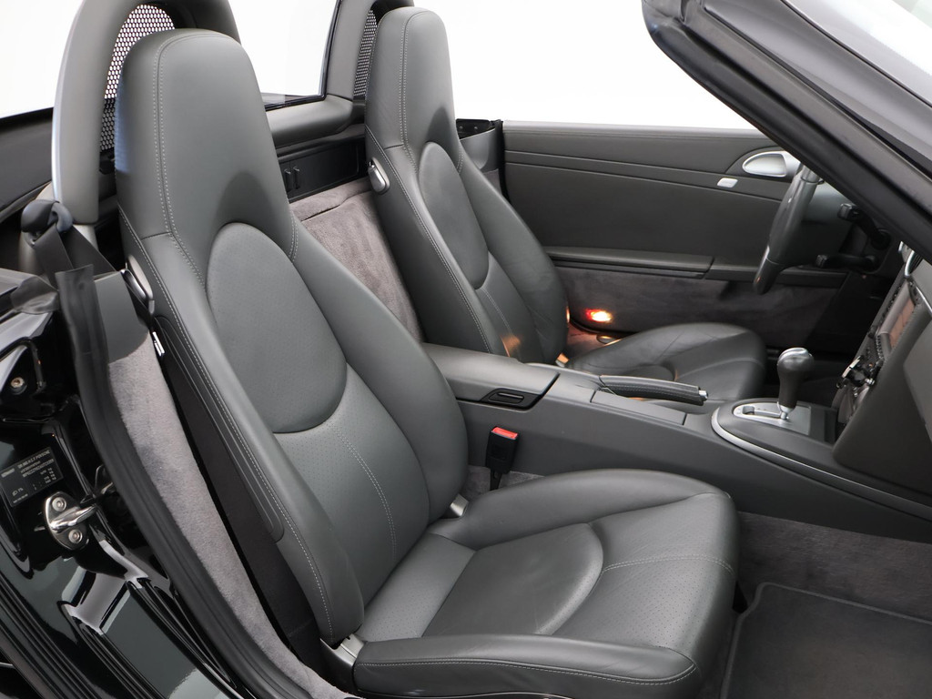 Boxter S met de 3.2 280 PK motor, Tiptronic automaat, Originele boekjes en complete onderhoudshistorie aanwezig, Zwart met grijs volledig leder interieur, Elektrische stoelverstelling met geheugen, Stoelverwarming, Navigatie, Bi-Xenon koplampen, Hoogglans zwarte 19 inch lichtmetalen velgen, Rode remklauwen, Cruise control, Climate control, Elektrische achterspoiler, Zij-airbags, Lederen afwerking in de deurpanelen en middentunnel, Lederen afwerking rondom de tellers, Witte tellerplaten, Boardcomputer, Zwarte elektrische softtop cabriokap.